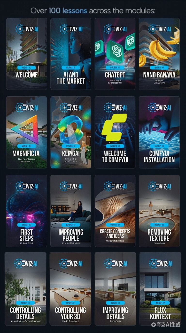 想让建筑效果图、动画几分钟内达到影视级写实效果?《DVIZ AI for Archviz》是全球最完整的建筑可视化 AI 课程,20 小时 + 100 节实战课,用 ComfyUI、Nano Banana、Magnific、Kling 等 AI 工具,零基础把简陋渲染变成超写实作品,支持中文字幕,大幅提速接单与出图流程。